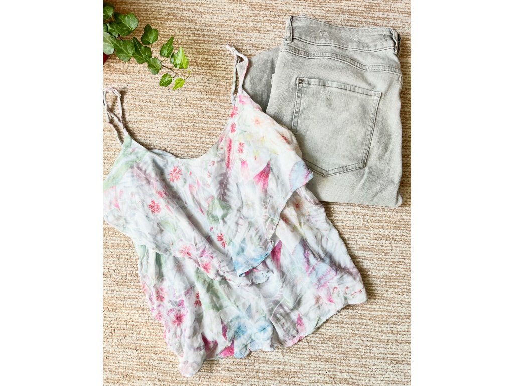 Velmi dobrý stav. Lehké barevné květované tílko z viskózy, velikost M, nastavitelná posuvná ramínka.
