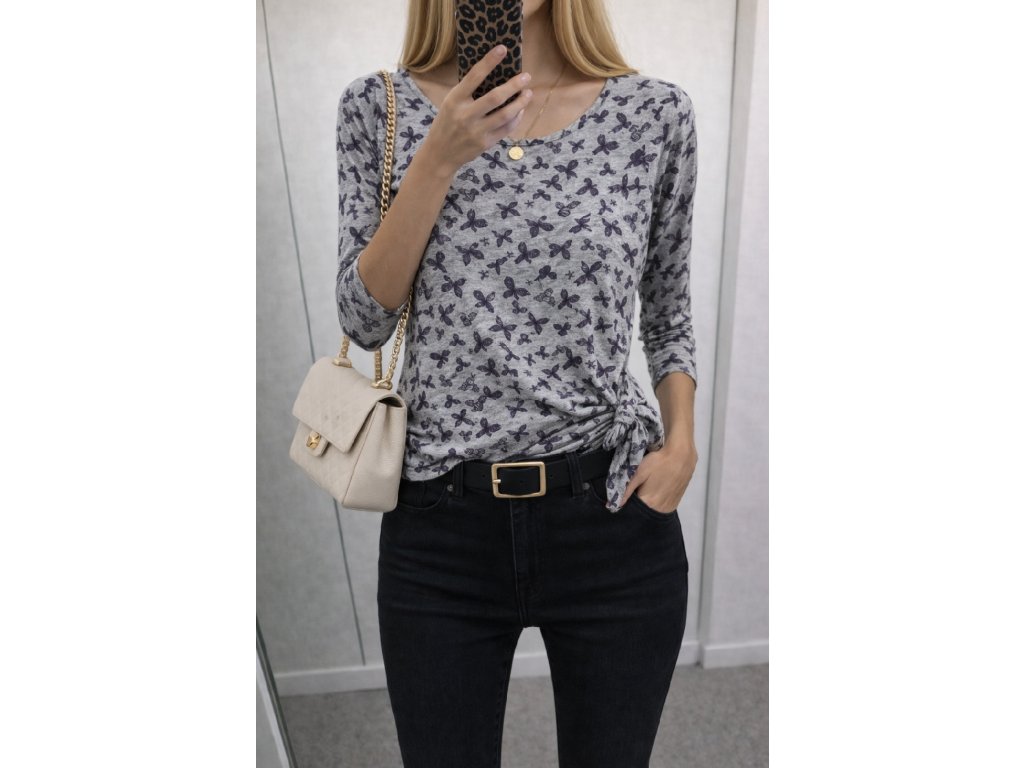 Velmi dobrý stav. Triko z viskózy a elastanu s roztomilým potiskem motýlků. Uzlík na boční straně, rukáv 3/4. Velikost značena UK 12, padne hezky velikosti M a L. Hodně pruží a krásně se přizpůsobí.