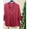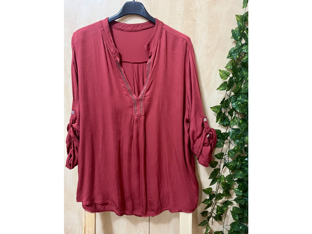 Lehká vínově červená halenka se zdobeným výstřihem, roll-up rukávy. Velikost univerzální. Zadní díl prodloužený.