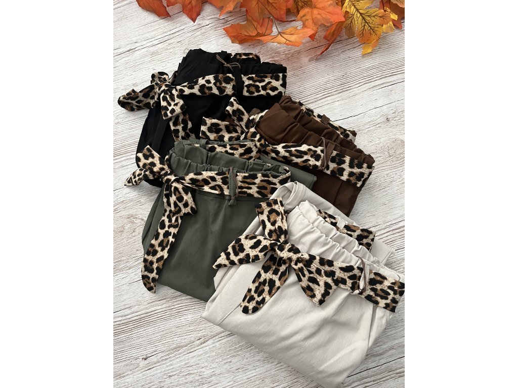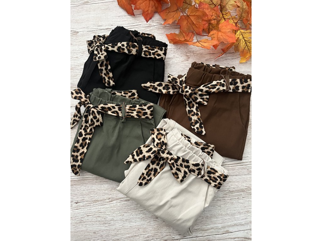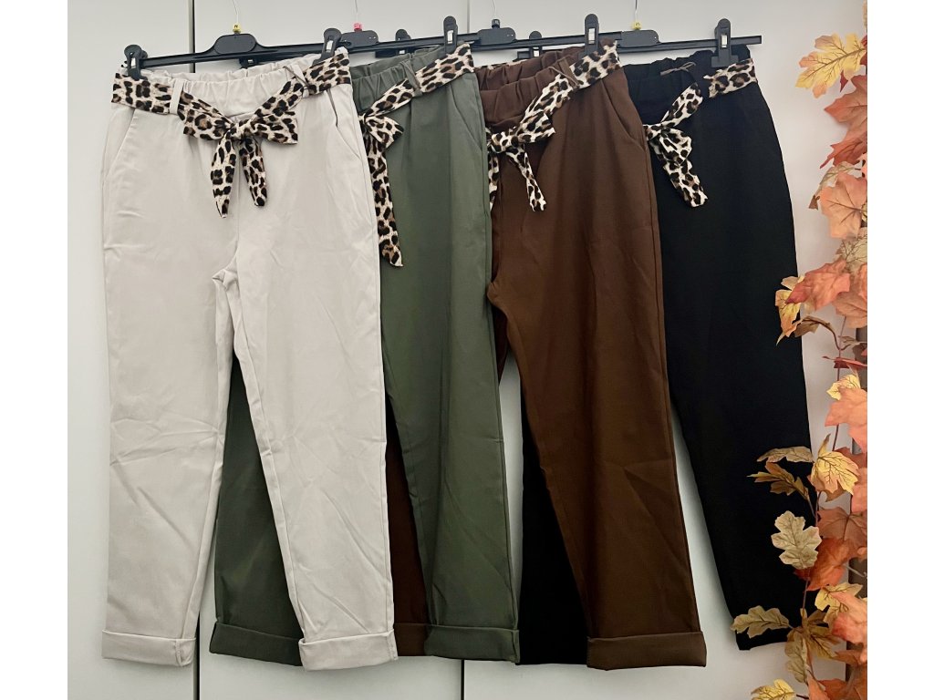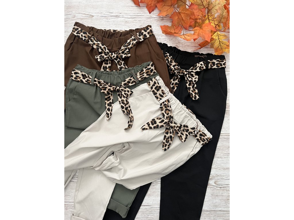 Stylové, sportovně-elegantní plátěné kalhoty z velice příjemného materiálu. Mají kapsy a součástí je leopardí pásek. Je možno nosit i bez něj.