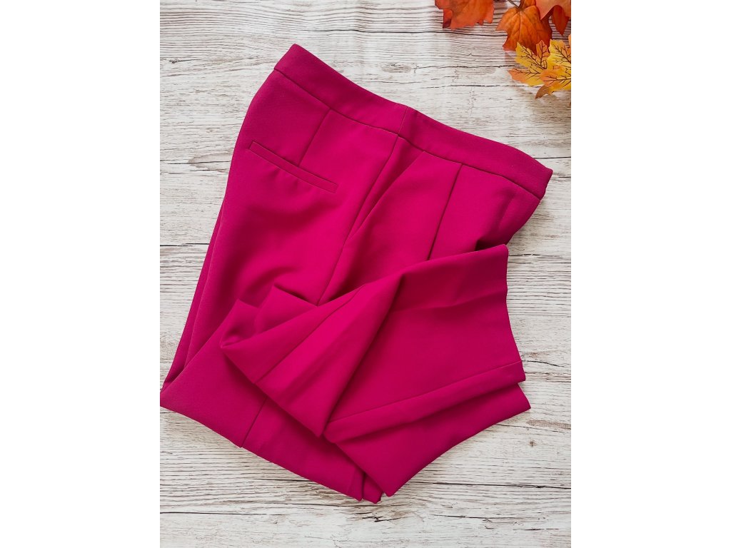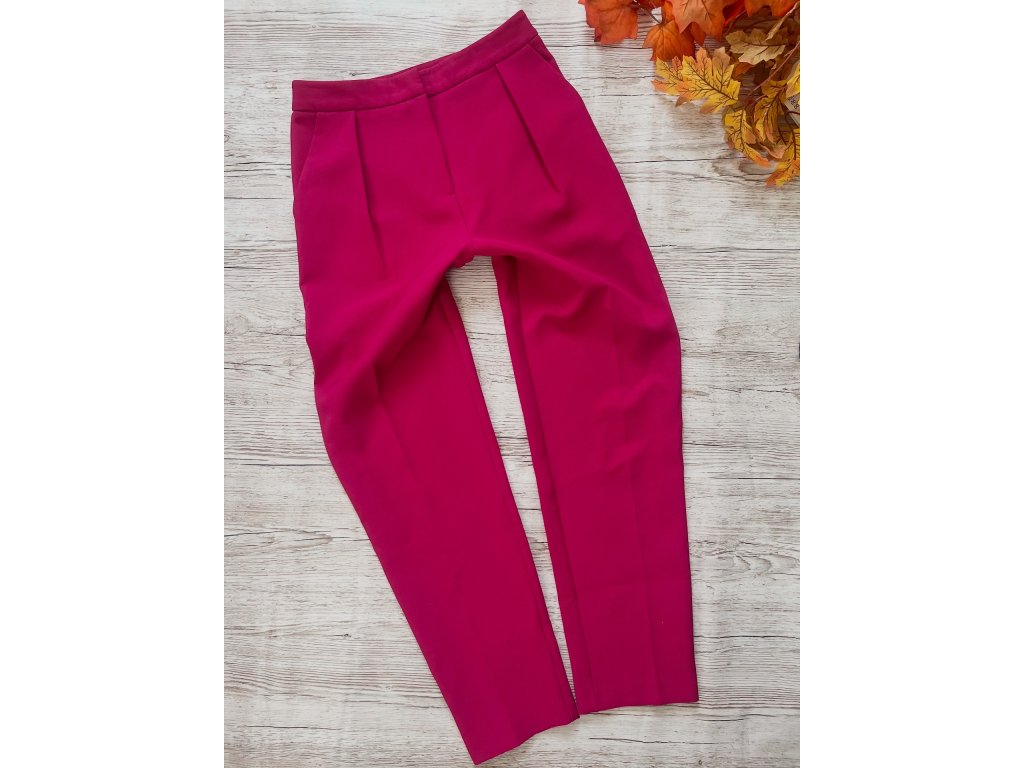 Velmi dobrý stav. Nádherné sytě růžové, výrazné kalhoty s vysokým sedem Topshop. Velikost 38. Kalhoty jsou ze silnějšího materiálu, vhodné na jaro/podzim, mají boční kapsy, vzadu kapsy falešné.
