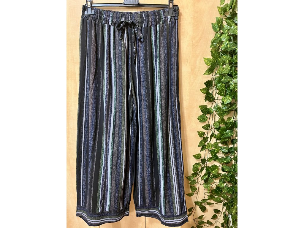 Moderní, splývavé, široké kalhoty v midi délce. Pas na pružnou gumu, takže si je posadíte jak vysoko chcete. Z vnitřní strany jsou černé. Velikost univerzální, padnou až po velikost XL.