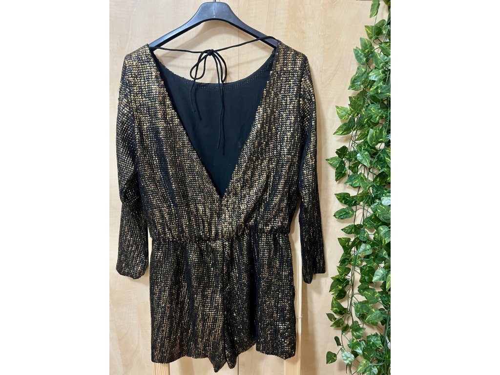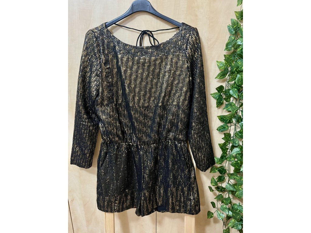 Velmi dobrý stav. Úžasný kraťasovy overal bohatě zdobený flitry, vhodný na párty, společenské události nebo jen tak třeba na promenádu k moři. Overal je velikosti S, má podšívku, vzadu holá záda a za krkem vázání na šňůrky. Pas je na pružnou gumu, overal má i boční kapsy.