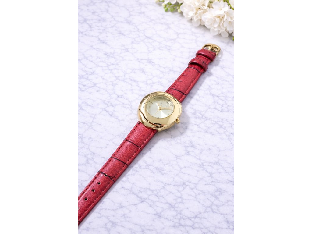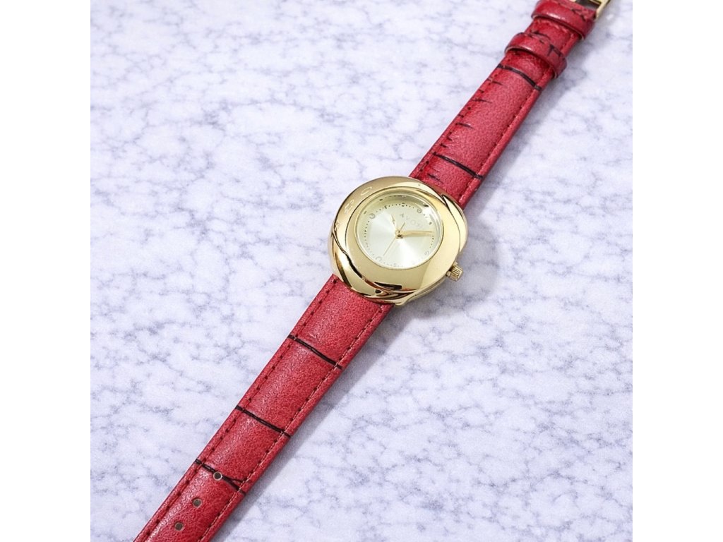 Zlaté hodinky s červeným řemínkem Avon
