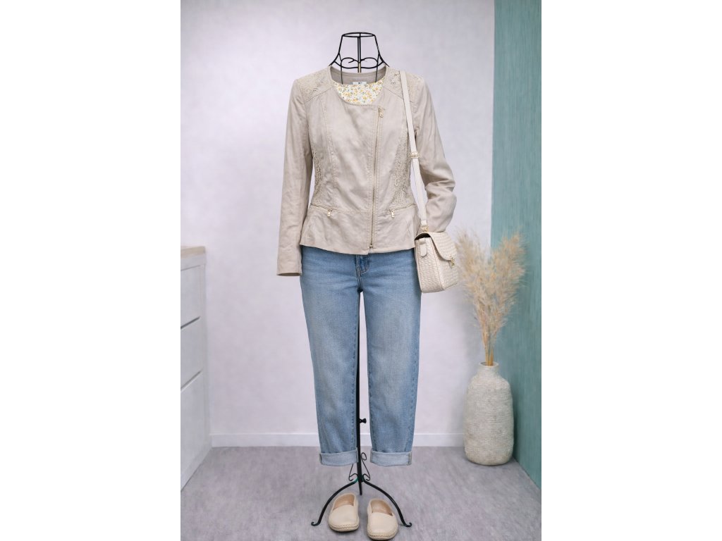 Velmi dobrý stav. Stylová, lehká bunda zdobená krajkou, zapínání na zip. Velikost 40. Padne hezky i velikosti 38. Vepředu dvě kapsy na zip. Bunda má podšívku, v ramenou vycpávky.
