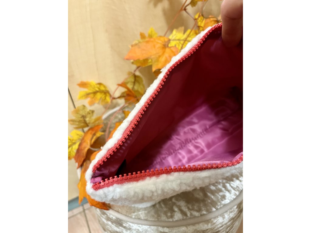 Prostorná bílá plyšová kosmetická taška, velmi příjemná na dotek, zapínání na zip, dno červené barvy, vnitřní část růžová, nápis vyšitý barevně.
