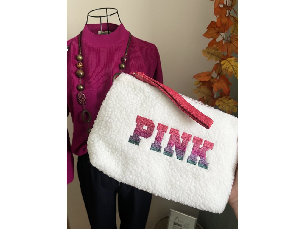 Bílá plyšová kosmetická taška s barevným nápisem Pink Victoria's Secret