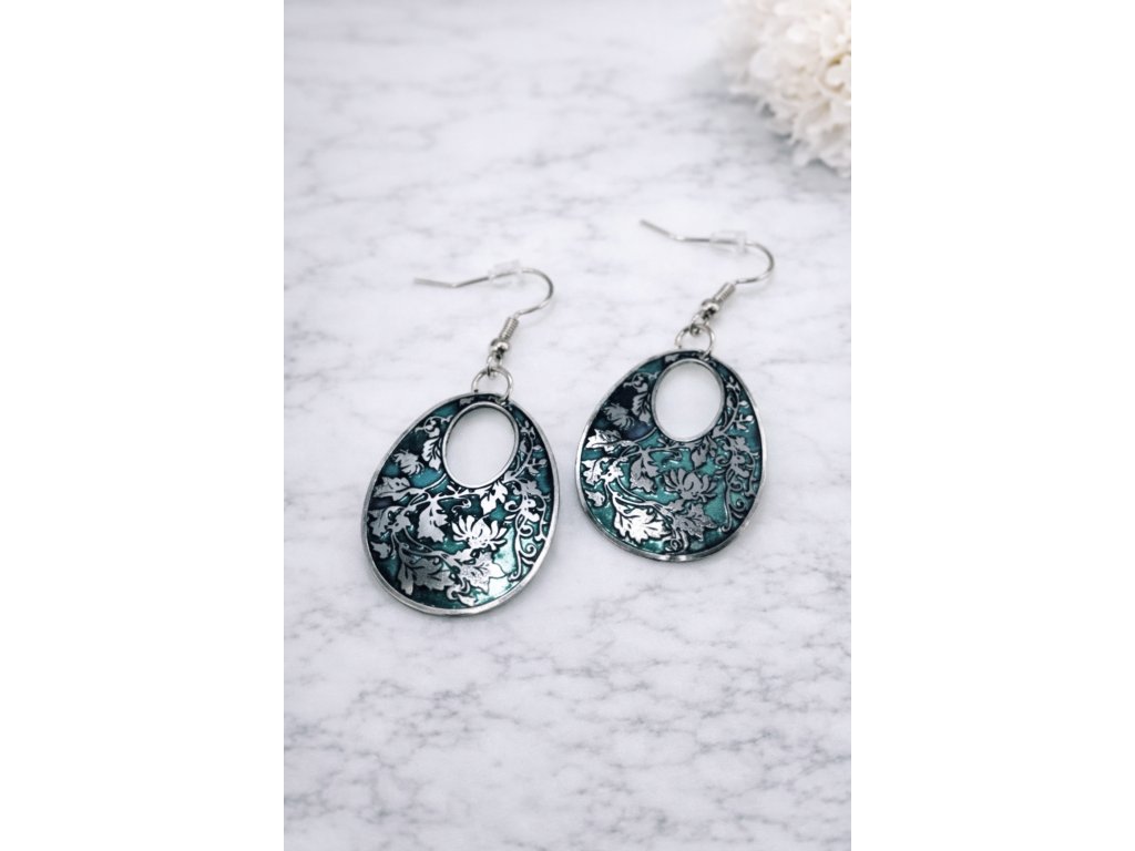 Lehounké výrazné kovové naušnice s vytlačovanými motivy, barva tyrkysová.
